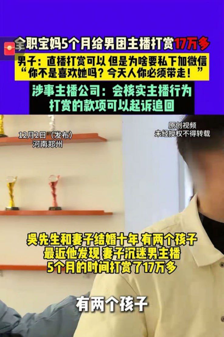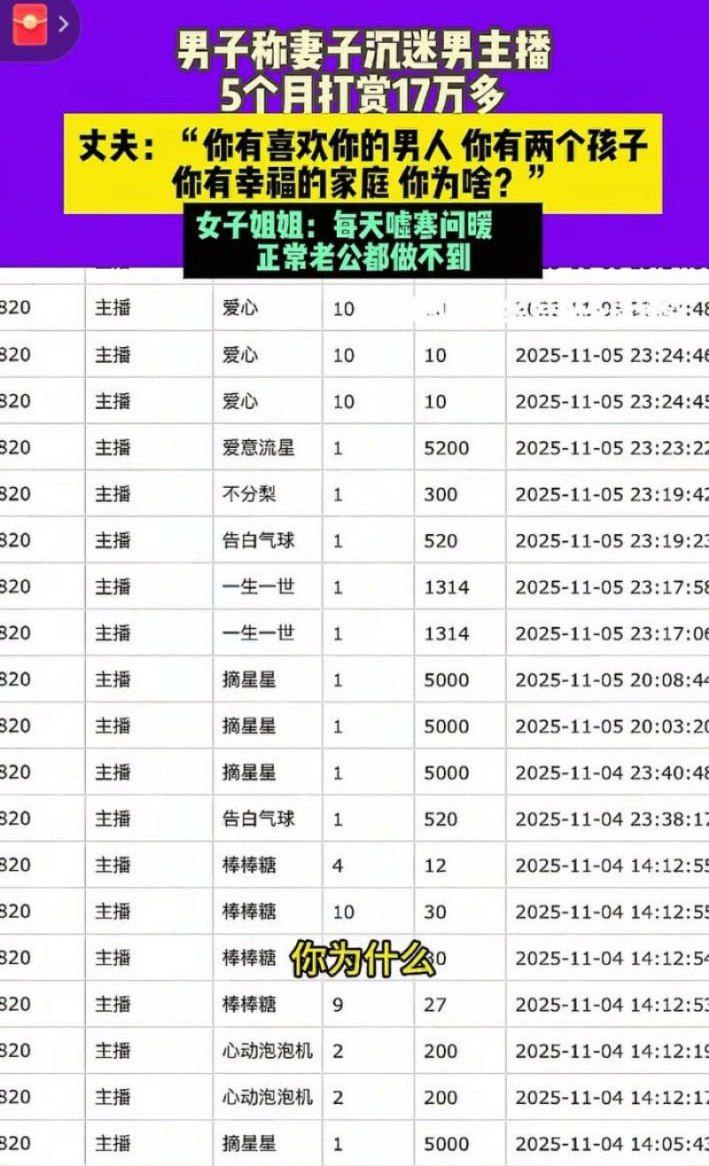 河南一全职宝妈沉迷直播,半年内给某男主播打赏17万。聊天记录完整曝光,从姐姐真大方到老公不疼你我疼,男主播天天私信嘘寒问暖,发语音卖惨,宝妈逐渐上头,瞒着丈夫刷信用卡,卖金饰。记录显示男主播一步步套路,最终宝妈答应线下见面。数百页聊天记录触目惊心,从日常关心到露骨撩拨再到约会开房,全程被截图曝光,网友直呼杀猪盘教科书。